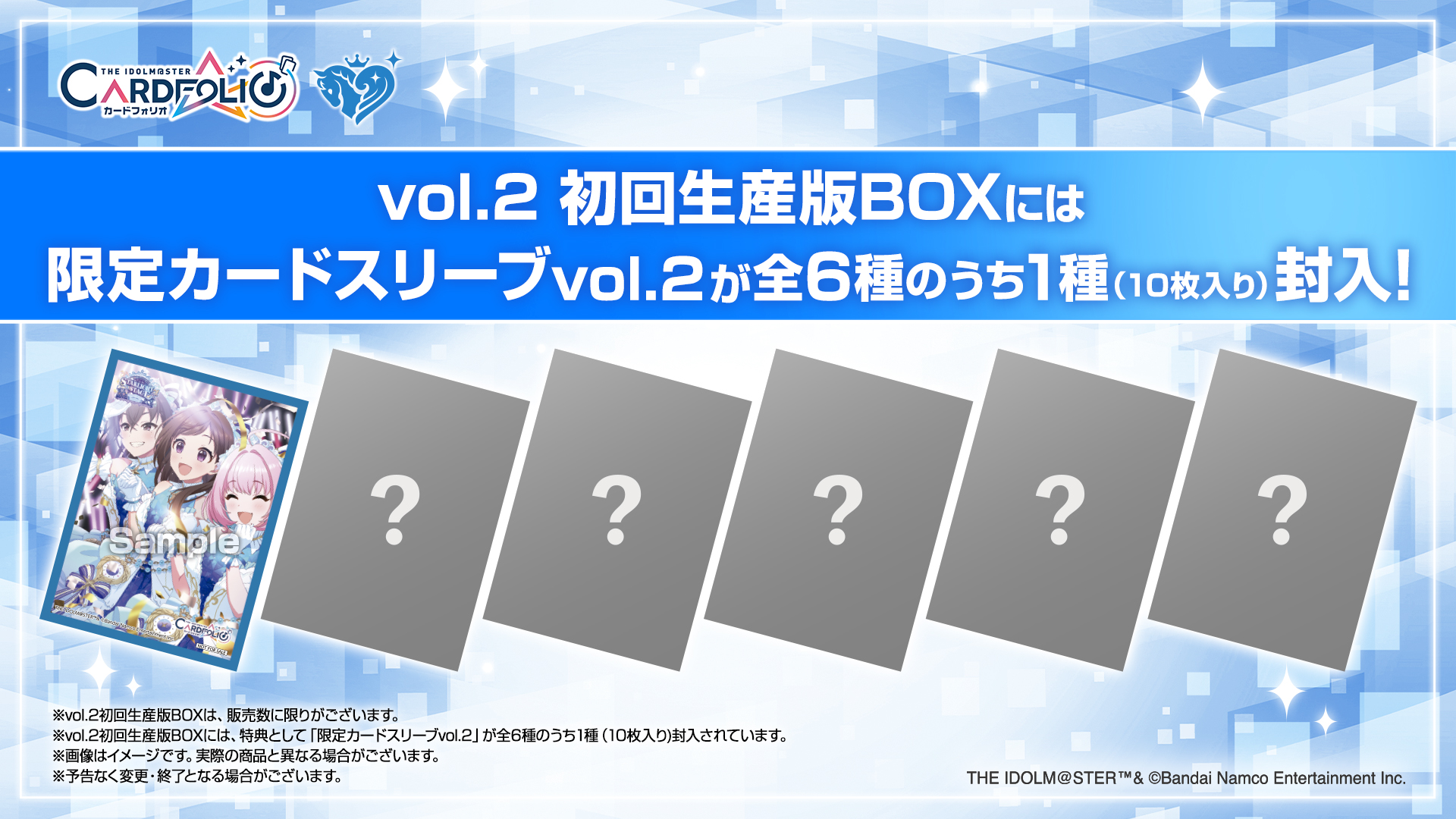 また、シンデレラガールズver. vol.2の初回生産版BOXには限定カードスリーブ vol.2(全6種)がランダムで1種(10枚入り)封入されますのでお見逃しなく!