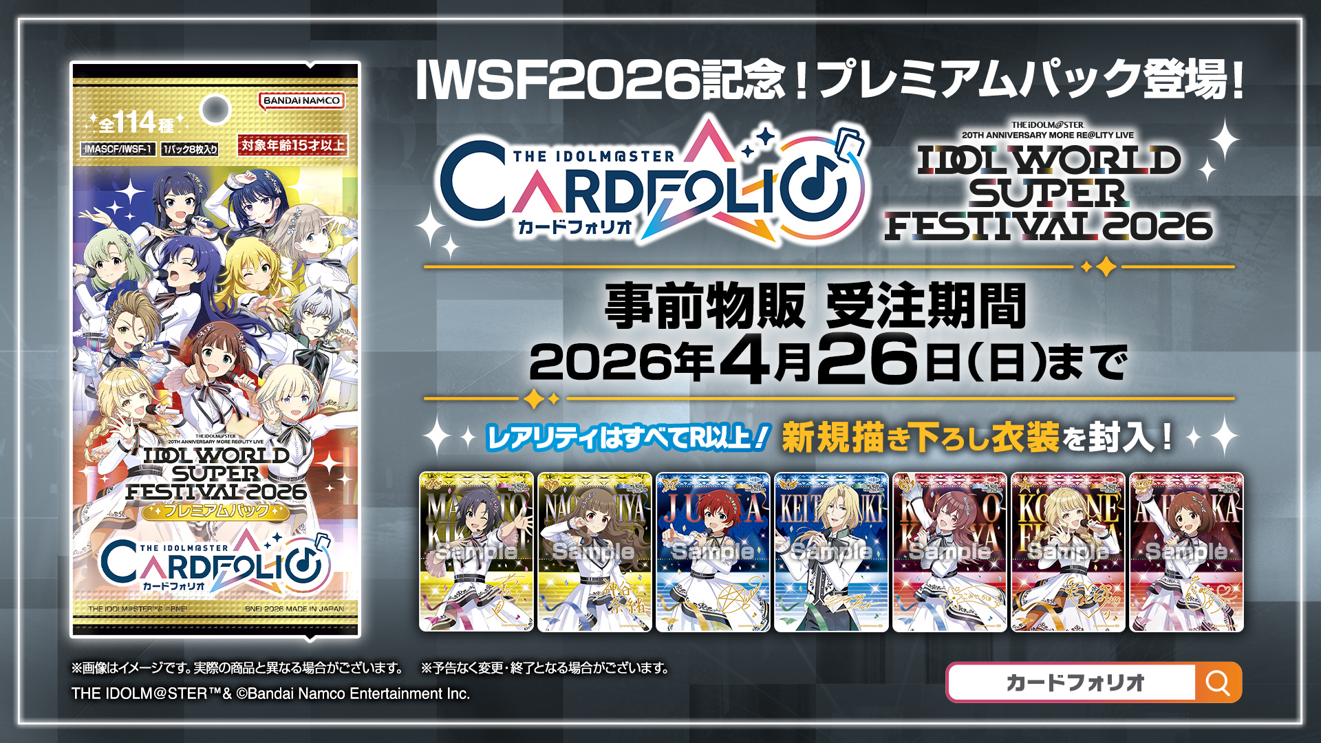 「THE IDOLM@STER 20th Anniversary MORE RE@LITY LIVE IDOL WORLD SUPER FESTIVAL 2026」開催を記念して、すべてのカードがキラッと光るプレミアムパックの発売が決定!